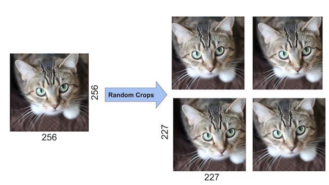 Nhóm tác giả của AlexNet rút trích ngẫu nhiên bức ảnh có kích thước 227x227 từ bức ảnh 256x256 ban đầu làm input dầu vào cho mô hình. Bằng cách này, chúng ta có thể tăng số lượng dữ liệu lên gấp 2048 lần bằng việc sử dụng cách này.